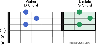 Playing chords on the ukulele is much alike that of a guitar. The main difference being the guitar has 6 strings and the ukulele only has 4. So when we are reading our ukulele chord windows there will only be 4 vertical lines that represent each string. You can see the difference between both below: