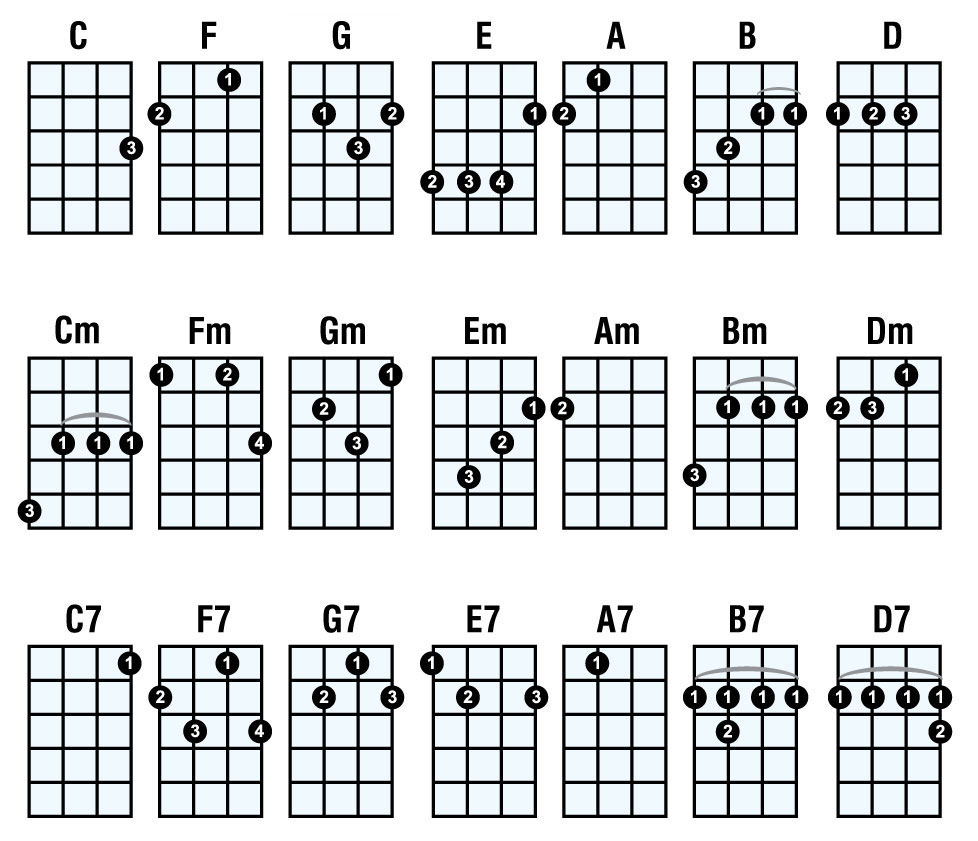 Below is a bunch of commonly used chords on the ukulele. Give each of them a go: